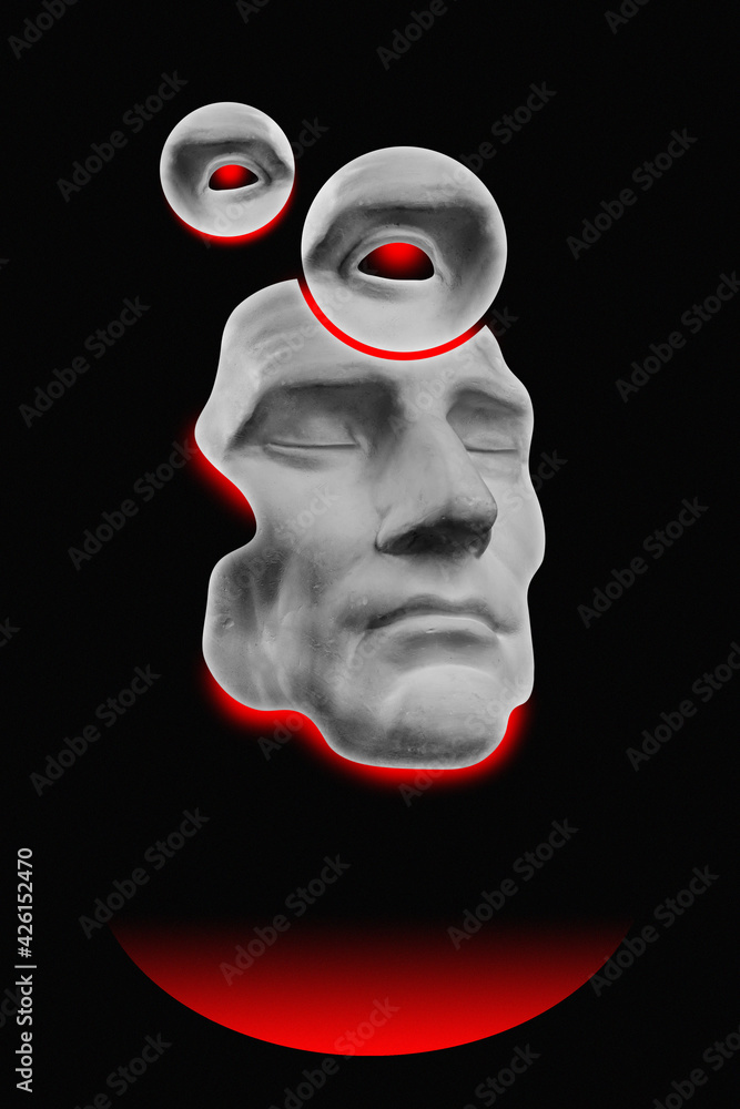 Premium Photo Antique Sculpture Of Human Face Surreal Collage In Pop Art Style Modern Image With Cut Details Of Statue Head Red Eyes Dark Concept Zine Culture Contemporary Art Poster Funky